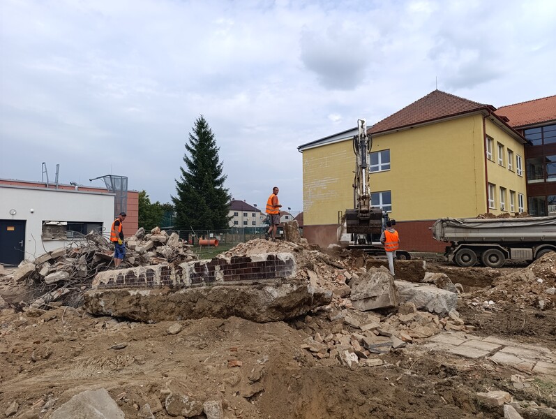 Stavební práce začaly bouráním původní budovy bývalé bytovky. Nejprve bylo nutné upravit okolí – odstranily se keře, ploty a oplechování. Poté dělníci sundali střešní krytinu, dřevěný záklop a následně začaly mizet i zdi objektu. Po dokončení demolice bude hlavním úkolem přeložení plynovodu a vodovodu.