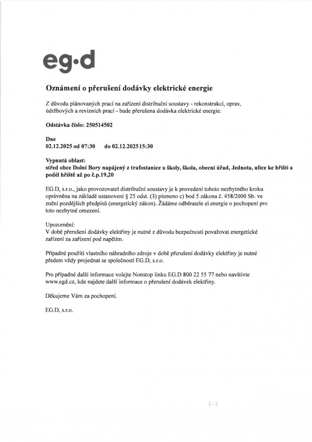 prerusenielektrikyZ důvodu plánovaných prací na zařízení distribuční soustavy bude přerušena dodávka elektrické energie v obci nasládovně: