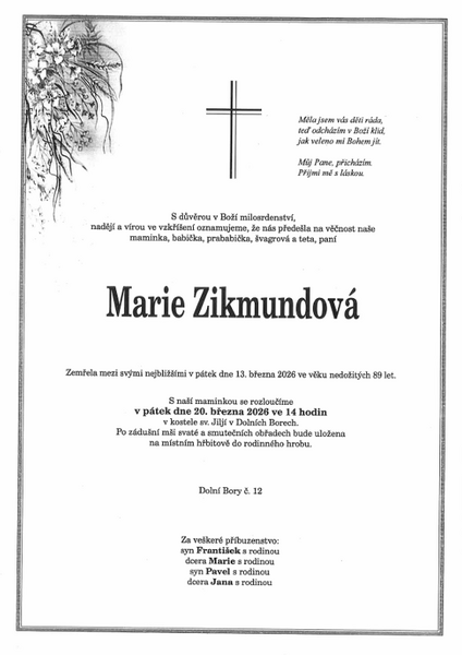 Snímek obrazovky_2026-03-16_105728Dne 13. března 2026 zemřela ve věku nedožitých 89 let paní Marie Zikmundová. Poslední rozloučení proběhne v pátek 20. března 2026 v kostele sv. Jiljí v Dolních Borech.